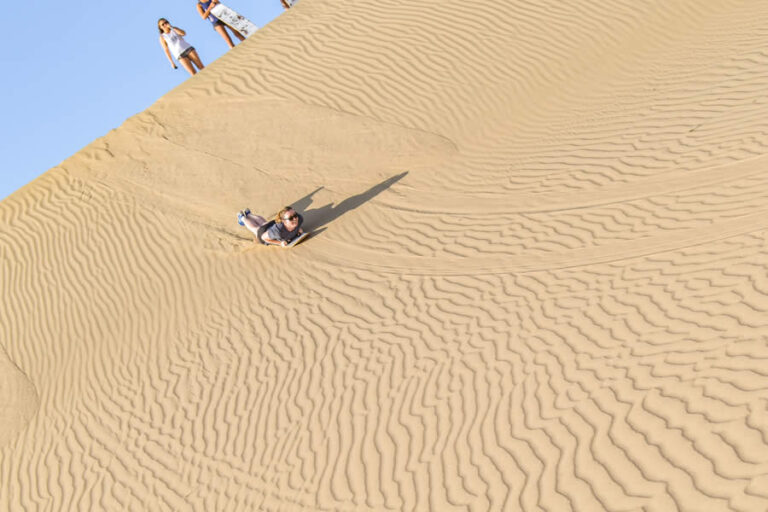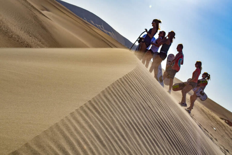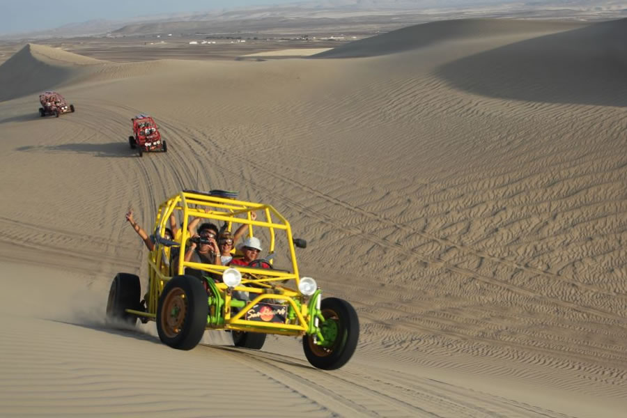 A la hora indicada abordaremos nuestro carro arenero (Buggies), luego de unos 20 minutos de recorrido llegaremos hasta la zona del desierto donde encontraremos una serie de dunas grandes y pequeñas la cual nuestro carro arenero irá subiendo y bajando sintiendo mucha adrenalina, asimismo haremos unas paradas en las dunas que ofrecen las condiciones adecuadas de práctica de Sandboarding para los principiantes y también para los deportistas profesionales. También apreciaran el paisaje del desierto y podrán tomarse fotografías.